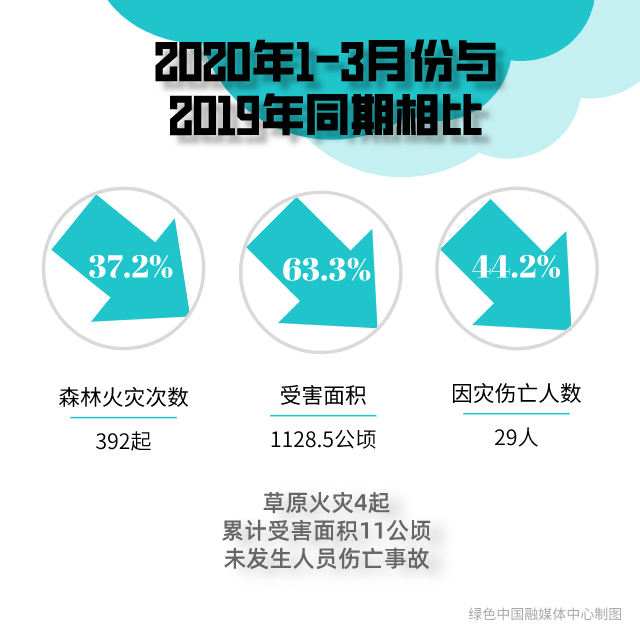 According to statistics, there were 392 forest fires from January to March this year (including 148 general fires, 52 major fires, 1 major fire, and no particularly serious fires), with an area of 1128.5 hectares and 29 casualties. Compared with the same period in 2019, the number of forest fires, the number of damaged areas and the number of casualties due to disasters decreased by 37.2%, 63.3% and 44.2% respectively; there were 4 grassland fires in China, The total damaged area was 11 hectares, no casualties occurred, and the fire index decreased significantly.